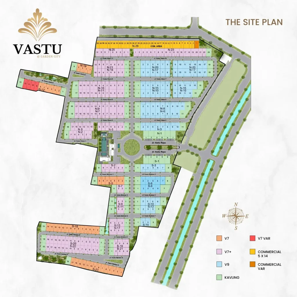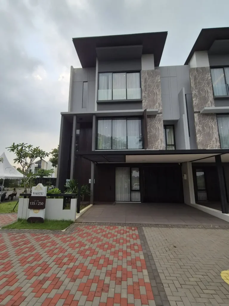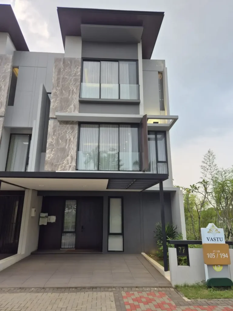 Unit-unit rumah di Cluster Vastu mengedepankan desain modern minimalis tiga lantai dengan tampilan yang lebih kekinian serta berkelas. Sebagai contoh, tipologi fasad dari unit-unit rumah Vastu dirancang dengan permainan geometri garis vertikal dan horizontal dengan mengusung atap datar. Di sisi lain, pemilihan warna earthy tone yang senada membuat tampilan rumah ini lebih elegan dan homey. Setiap rumah juga dirancang dengan menempatkan bukaan besar pada setiap jendela sehingga memudahkan sirkulasi udara dan cahaya matahari untuk masuk ke dalam ruangan.
