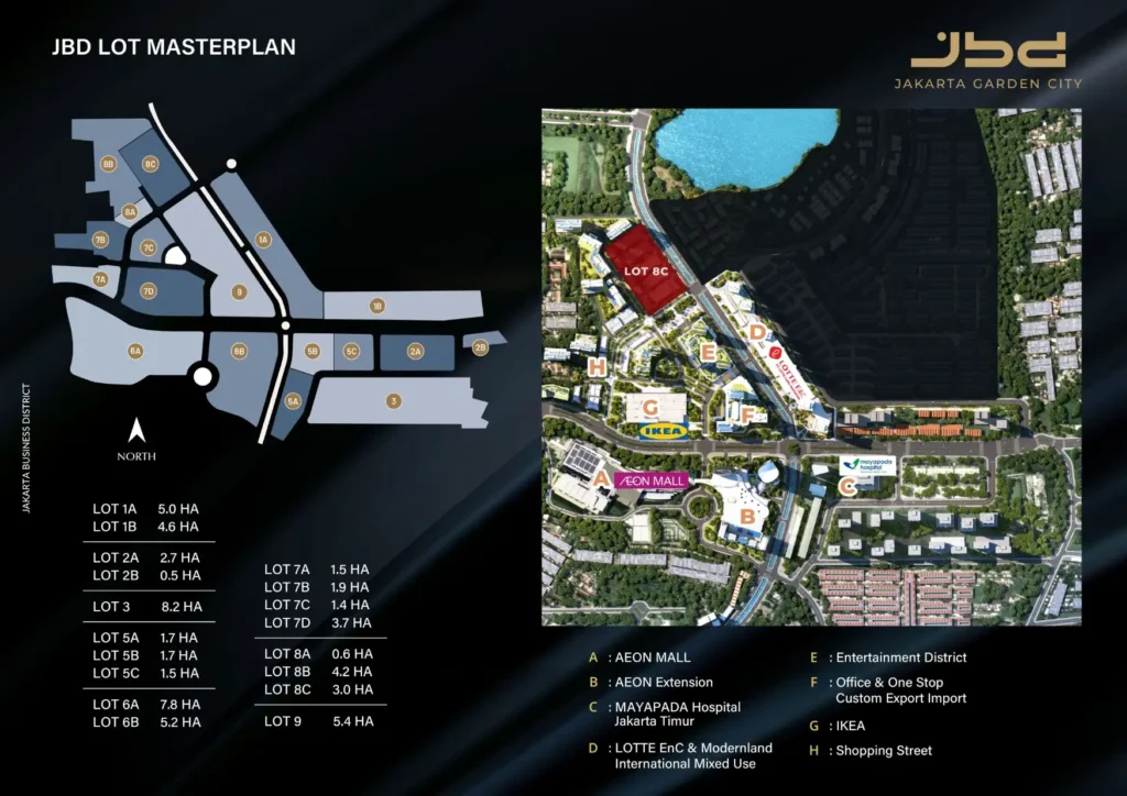 Selain pusat bisnis, kawasan Jakarta Business District (JBD) dengan estimasi GDV (Gross Development Value) sebesar US$ 2 Miliar Dollar juga terintegrasi langsung dengan kawasan residensial premium, pusat perbelanjaan AEON Mall, IKEA, area komersial, pusat pendidikan dan pusat kesehatan.